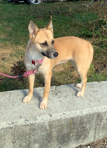 Gabriella is the softest girl in every way. She is extremely gentle by nature, and her coat is silky soft. With her big, alert ears and her white- tipped tail, this little 32 pound Chinook/ Feist mix looks like a tawny fox.