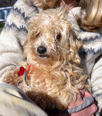 A 30 pound 6-year-old Mini Goldendoodle, and I’m looking for a forever home with my sister, Sugar!