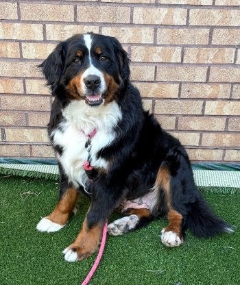 A 6–7 year old, 70-pound Bernese Mountain Dog who has endured more than her fair share of neglect—but you’d never know it from the way she leans into your legs, quietly asking for affection with those soulful eyes.