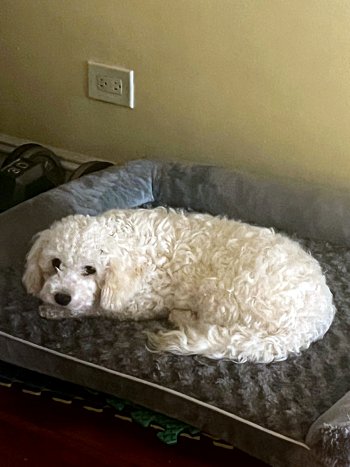 A 10-month-old Labradoodle/Terrier mix weighing about 31 pounds, and I’m basically sweetness wrapped in fur.