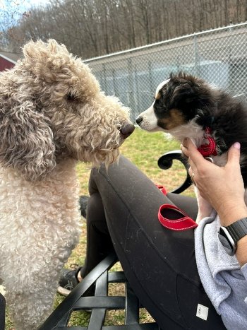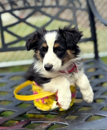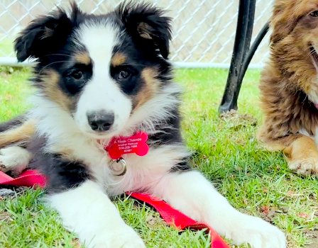 Helloooooooo, I’m Joey, Joelyn, Lil girl Joey, a 3 month old 8 pound Mini Australian Shepard! I’m a happy, spunky, fun-loving puppy. I love to romp around and play. I came here with my mama, you can see her on the website too! Her name is Lili Belle. Just in case you’re wondering where I got my good looks. Somehow I’m much smaller than her though and I was born with cataracts in my eyes. But that doesn’t stop me. No sir! I’m friendly and brave. I’ll meet any new person or dog that comes my way with a wagging tail. Everyone says they like watching me run in the play yard because it’s just “pure joy”. I’m not sure what that means yet but maybe I’ll understand when I’m older. It would probably be best if you had another dog in the house, because I’m still young, and they can help teach me how to be a big girl and grow to be independent. I really enjoy cuddling up to my mom, but I know she needs to find her own home too; I’m looking forward to starting my own path. I’d be happy to meet you, play, and make you smile. I’m pretty good at it. What’s not to be happy about? Life can be so great!