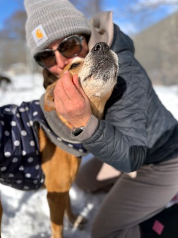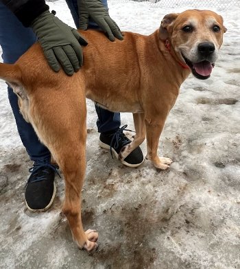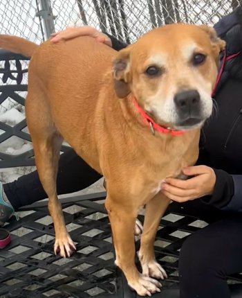 Well hello there! My name is Lola and I’m an 8-10 year old Lab/Hound mix, 55-pound sweetheart with the gentlest soul. I’m Teddy’s mom, and just like him, I have a lot of love to give. I’m very affectionate (kisses are my favorite) and love making new friends with everyone. You’ll know how excited I am to meet you because of my smiling face and wagging tail! I’m house-trained, friendly, and walk nicely on leash so I’m a pretty great companion if I don’t say so myself! Even though I’m a mature lady, don’t let my age fool you- I still have a super playful side. I enjoy running around, stretching my legs, and having moments of fun, then happily settling back down for some cuddle time. I’m the kind of dog who brings a soothing presence into a home — steady, loving, and always happy just to be with you. I don’t ask for much — just a family who wants a loyal companion to share their days with. If you’re looking for a calm, loving dog who will walk by your side and curl up close at the end of the day, I’d love to be a part of your family.